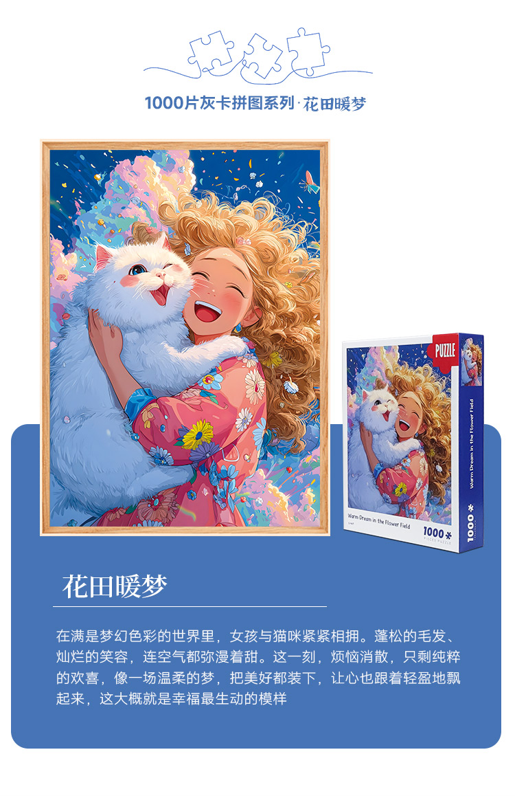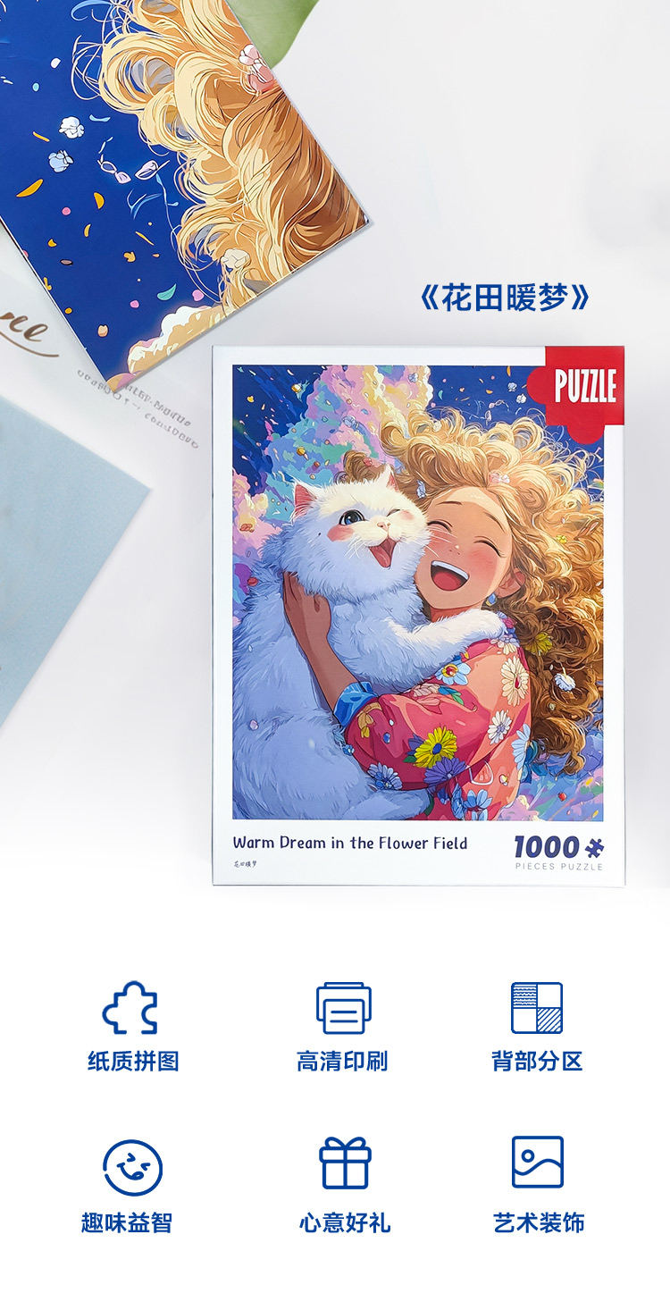拼圖名稱:花田暖夢(mèng)-83127 拼圖尺寸:700*500MM 拼圖材質(zhì):紙質(zhì)灰卡 拼圖片數(shù):1000片 加工方式:廠規(guī)、來(lái)圖定制 包裝尺寸:180*130*50mm