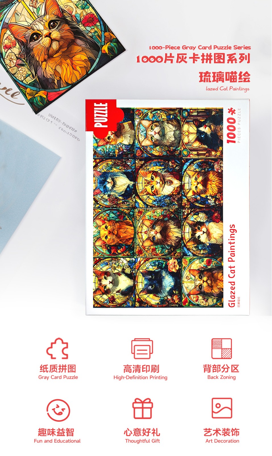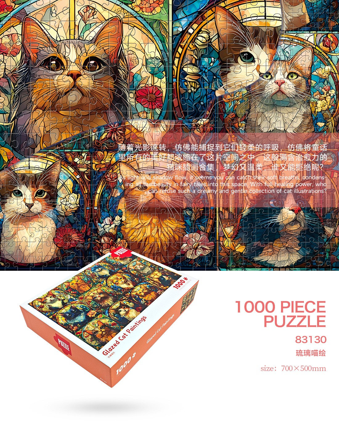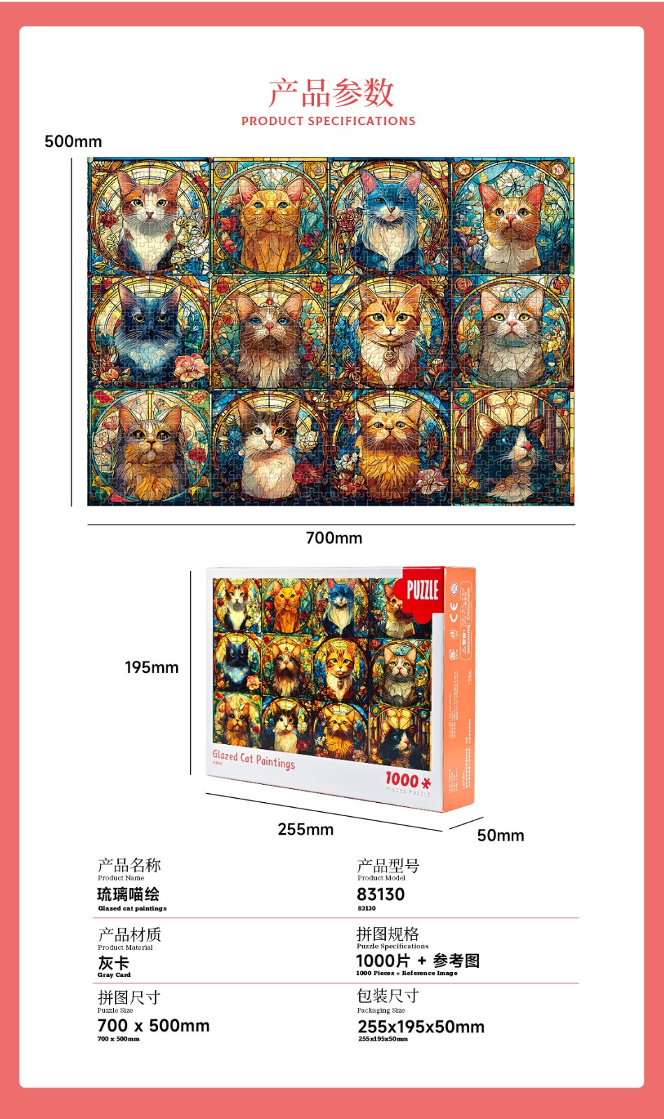 拼圖名稱:琉璃喵繪-83130 拼圖尺寸:700*500MM 拼圖材質:紙質灰卡 拼圖片數:1000片 加工方式:廠規、來圖定制 包裝尺寸:180*130*50mm