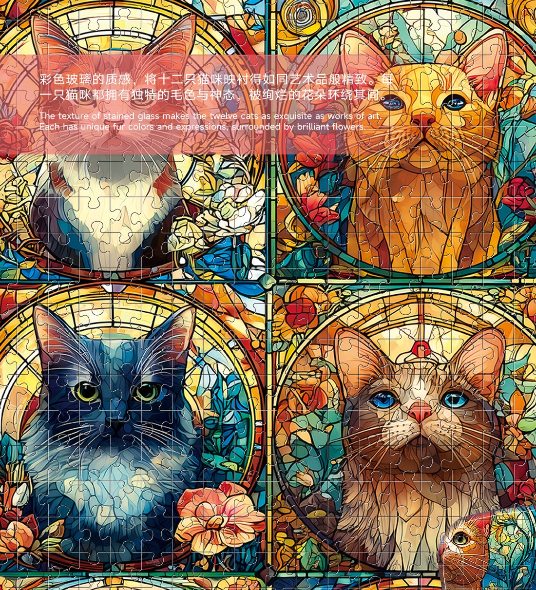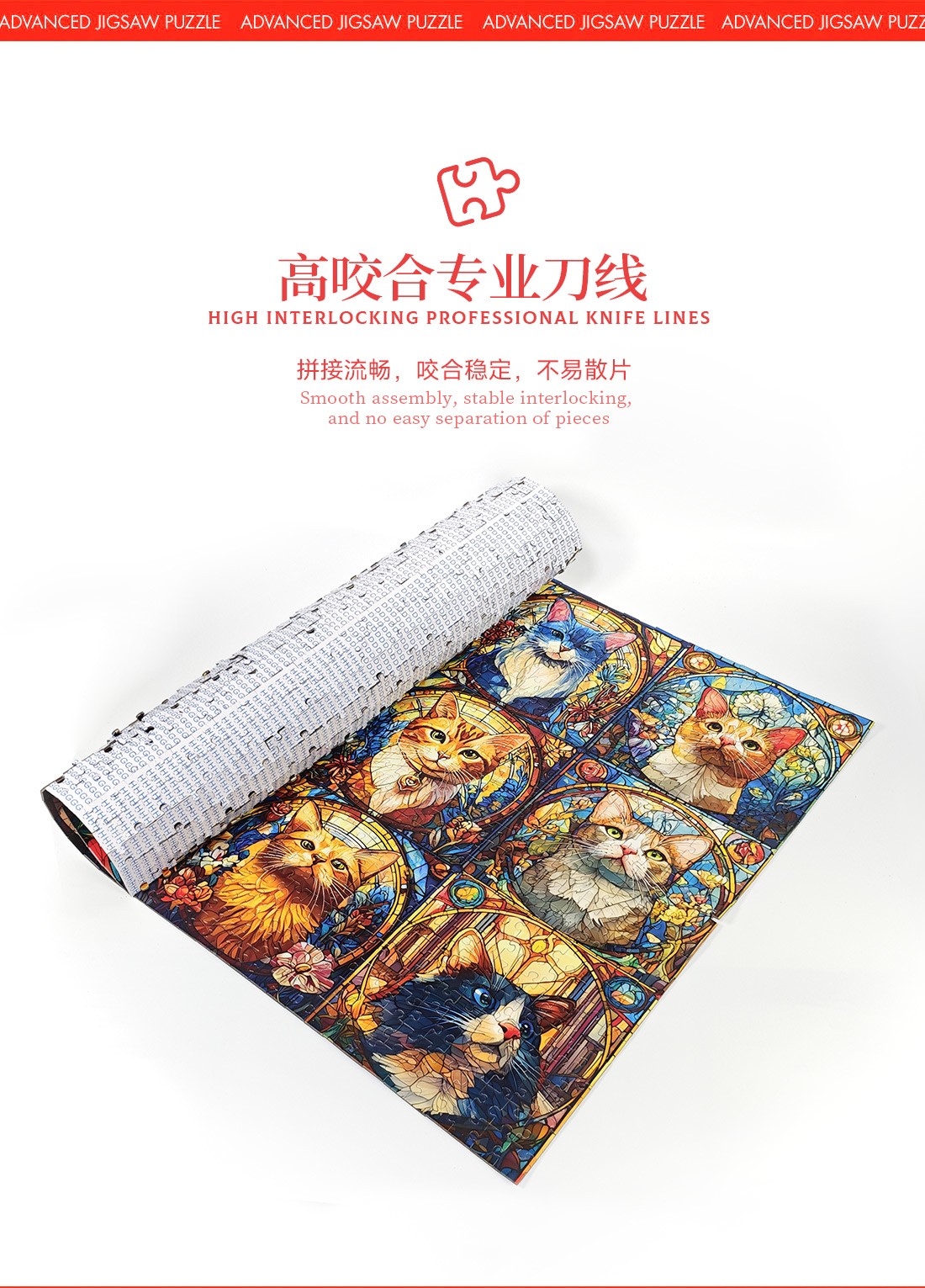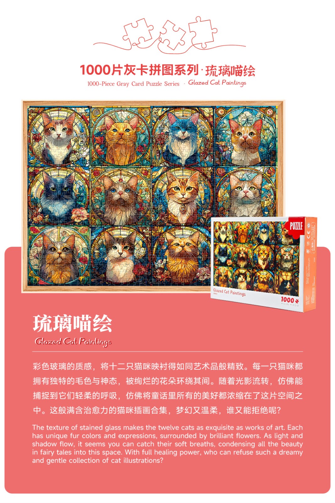 拼圖名稱:琉璃喵繪-83130 拼圖尺寸:700*500MM 拼圖材質:紙質灰卡 拼圖片數:1000片 加工方式:廠規、來圖定制 包裝尺寸:180*130*50mm