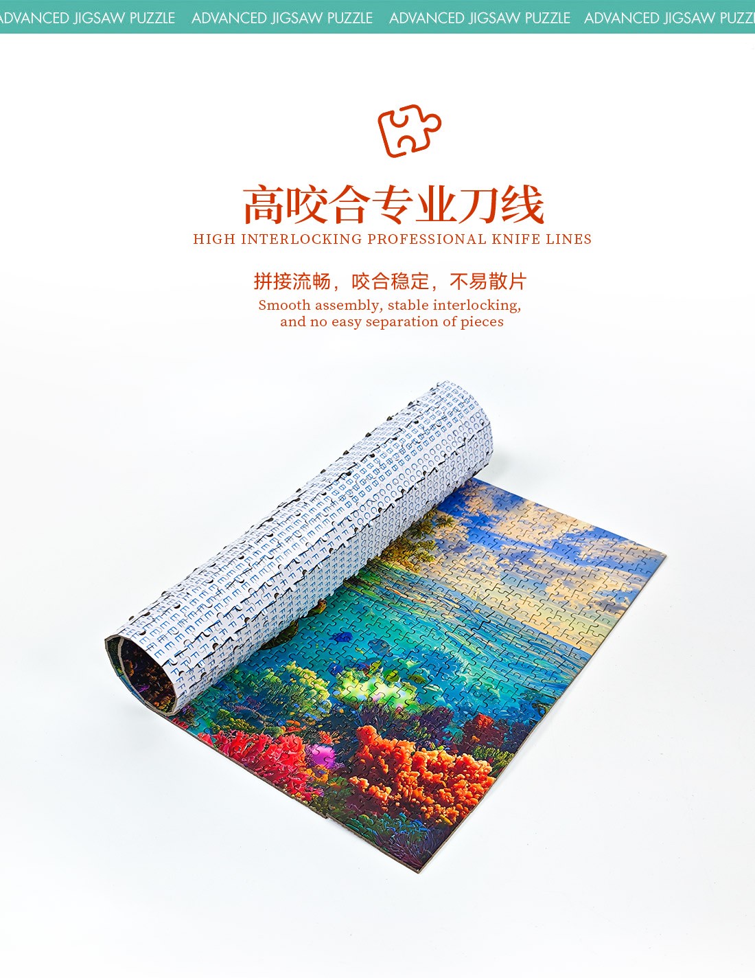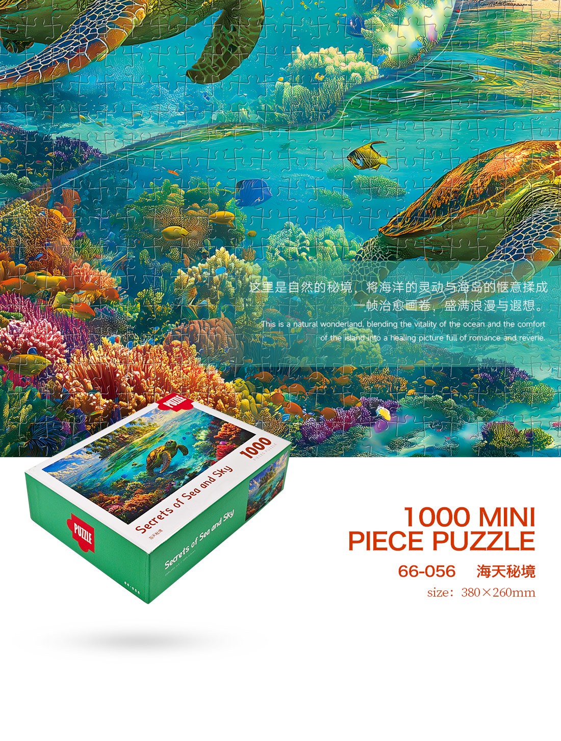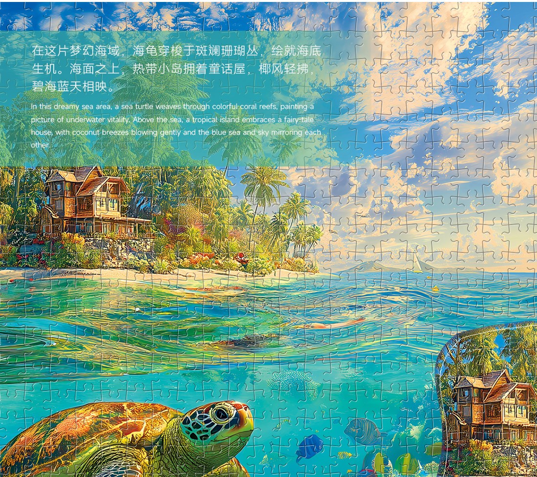 拼圖名稱:海天秘境 拼圖尺寸:380*260MM 拼圖片數(shù):細微灰卡1000片 加工方式:廠規(guī)、來圖定制 包裝尺寸:180*130*50mm